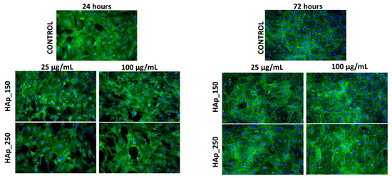 Fluorescence micrographs of MC3T3-E1 osteoblasts cultured for 24 h and 72 h in the presence of different concentrations (25 and 100 µg/mL) of HAp_150 and HAp_250 samples. The actin cytoskeleton is stained with phalloidin-FITC (green) and nuclei with DAPI (blue). All images were captured with a 10× objective.
