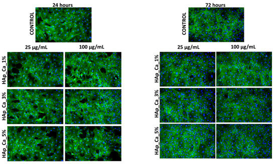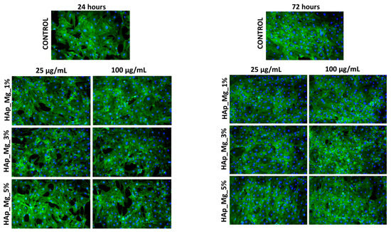 Fluorescence micrographs of MC3T3-E1 osteoblasts cultured for 24 h and 72 h in the presence of different concentrations (25 and 100 µg/mL) of HAp_Mg_1%, HAp_Mg_3%, HAp_Mg_5% samples. The Actin cytoskeleton is stained with phalloidin-FITC (green) and nuclei with DAPI (blue). All images were captured with a 10× objective.