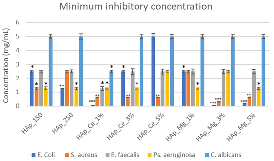 Minimum Inhibitory Concentration for hydroxyapatite samples. Results are calculated as means ± SD (n = 3); the statistical analysis: two-tailed Student’s test * p ≤ 0.05, ** p ≤ 0.01, *** p ≤ 0.001 were considered as statistically significant (for each strain).