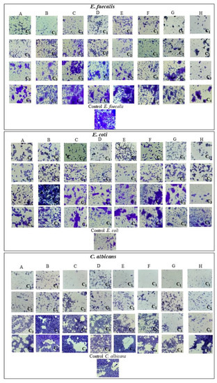 Optical microscopy for hydroxyapatite samples for E. faecalis, E. coli, C. albicans. A-HAp_150, B-HAp_250, C-HAp_Mg_1%, D-HAp_Mg_3%, E-HAp_Mg_5%, F-HAp_Ce_1%, G-HAp_Ce_3%, H-HAp_Ce_5%, C1-Concentration 1 (5 mg/mL), C2-Concentration 2 (2.5 mg/mL), C3-Concentration 3 (0.62 mg/mL), C4-Concentration 4 (0.15 mg/mL).
