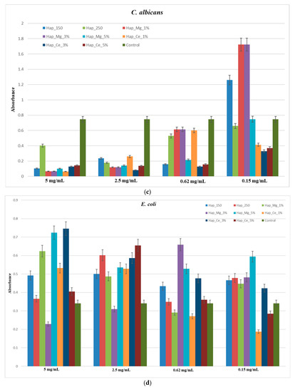 OD 492nm (Abs) results confirmed that hydroxyapatite samples could interfere with E. faecalis, E. coli., S. aureus, P. aeruginosa, and C. albicans biofilm formation. (Figure 15a–c). The hydroxyapatite substituted with cerium showed improved bacteria inhibition, as compared with hydroxyapatite substituted with magnesium. For the Gram-negative bacteria such as E. coli and P. aeruginosa, the samples showed a limited effect (Figure 15d,e).