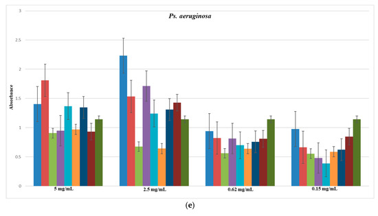 The minimum inhibitory concentration was evaluated after 24h. The concentration where the MIC was observed is presented in Figure 13. As observed, the MIC values range from 0.1–2.5 mg/mL for bacteria strains and 5 mg/mL for C. albicans.