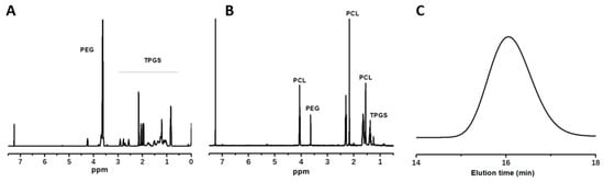 Characterizations of the synthesized polymers. 1H NMR spectra of TPGS (A) and TPGS–PCL (B) in CDCl3 and GPC of TPGS–PCL (C).