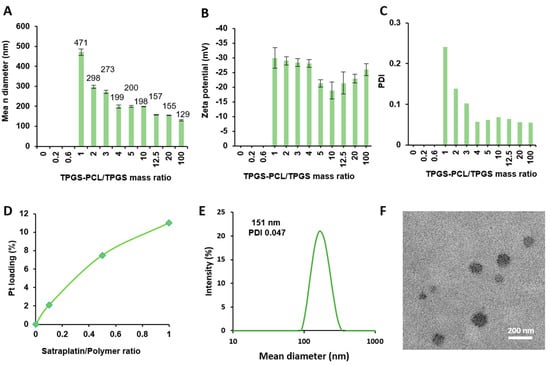The amphiphile of TPGS–PCL could readily self-assemble into nanoparticles with the PCL segments as the inner core and the TPGS segments as the hydrophilic shell. Moreover, TPGS was added to stabilize the micellar formation. Micelles of varied ratios of TPGS–PCL/TPGS were prepared and the diameter, PDI, and zeta potential are characterized in Figure 2A–C, respectively. The diameter decreased from 470 to 155 nm in the range of a TPGS–PCL/TPGS ratio from 1 to 20 (Figure 2A). Nanoparticles with a narrow PDI (below 0.1) were achieved when the TPGS–PCL/TPGS ratios were above 4 (Figure 2B). All micelles at varied TPGS–PCL/TPGS ratios exhibited similar zeta potential (nearly −25 mV) (Figure 2C). The hydrophobic nature of the PCL core is capable of encapsulating hydrophobic drugs. Hydrophobic satraplatin was entrapped at the optimized TPGS–PCL/TPGS ratio of 20 to formulate SatPt-NPs. The drug-loading percentage of satraplatin in nanoparticles increased by up to 11% with rising ratios of satraplatin/NPs (Figure 2D). The diameter and PDI of SatPt-NPs at 11% drug loading were 151 nm and 0.047, respectively (Figure 2E). Representative TEM morphologies of the SatPt-NPs are shown in Figure 2F. The SatPt-NPs exhibited spherical structures through TEM with an average diameter of approximately 130–140 nm, in agreement with DLS results.