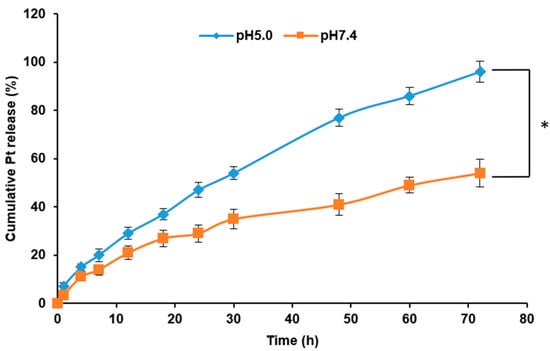 Drug-release profiles of the SatPt-NPs under incubation at pH 5.0 and pH 7.4. * p < 0.05.