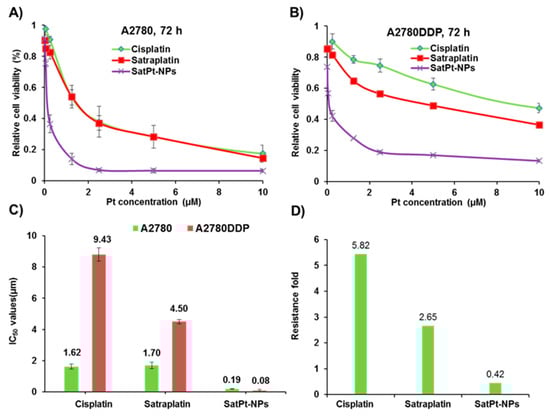 Cisplatin resistance overcome by the SatPt-NPs. In vitro cytotoxic evaluation of cisplatin, satraplatin, and the SatPt-NPs on A2780 (A) and A2780DDP cells (B) for 72 h. IC50 values (C) and drug resistance fold (D) of cisplatin, satraplatin, and SatPt-NPs on A2780 and A2780DDP cells at 72 h were calculated.