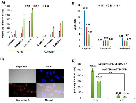 In general, the efficacy of cisplatin is majorly determined by its intracellular drug amount [29]. Pt drug internalization is considered an important factor for determining drug efficacy. The intracellular level of cisplatin, satraplatin, and SatPt-NPs at the same dosage of Pt (10 µM) by A2780 and A2780DDP cells at 1, 2, and 6 h was measured by ICP-MS. This provides important insight into how SatPt-NPs can overcome cisplatin resistance. As shown in Figure 5A, some important features exist for the uptake assay. For both A2780 and A2780DDP cells, the uptake of all drugs, including cisplatin, satraplatin, and SatPt-NPs, was increased from 1 to 6 h. Specifically, the progressive uptake of SatPt-NPs at 1, 2, and 6 h by A2780 cells was observed to reach from 711 and 1081 ng Pt/million cells to 1253 ng Pt/million cells, while this value changed to 250, 593, and 702 ng Pt/million cells for A2780DDP cells in the same period of time. Cisplatin and satraplatin also displayed similar changes. For the same drug at the same time point, less drug was determined to internalized into A2780DDP cells compared to A2780 cells. To provide better insight into this, the “reduced uptake fold” was determined for each drug by calculating the drug uptake by A2780 and A2780DDP cells. The results are shown in Figure 5B. From 1 to 6 h, the uptake fold of cisplatin was highest, though it decreased from 12.2 to 3.95. Unlike cisplatin, satraplatin showed an uptake fold of around 2.0 over this time and no obvious change was observed. However, the uptake fold for the SatPt-NPs was the lowest and decreased from 2.84 to 1.79 from 1 to 6 h. The limited difference in uptake of SatPt-NPs on A2780 and A2780DDP cells suggests that SatPt-NPs may be internalized to the cancer cells via a differing pathway from cisplatin and satraplatin. Taken together, cells treated with the SatPt-NPs maximized the amount of drug internalized, while the reduced uptake fold at different time points was minimized. Here, the unique uptake properties of SatPt-NPs may explain how they overcome cisplatin drug resistance.