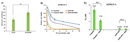 It is extensively reported that cisplatin-resistant cell lines have a higher expression of GSH, which is responsible for detoxification of Pt drugs in cells [30,31]. For the case of ovarian cancer, we tested the expression of GSH levels in A2780 and A2780DDP cells via a GSH assay. The results in Figure 6A show that A2780DDP cells have 1.5-fold more GSH than A2780 cells, in accordance with previously reported results [32]. This high expression of GSH contributes to cisplatin resistance in A2780DDP cells. The chemical inertness of satraplatin and further encapsulation within nanoparticles is speculated to eventually contribute to more inert responsiveness to GSH fluctuations in cancer cells and thus decreased resistance. To test this speculation, cells were pretreated with 200 µM of BSO for 12 h, which can deplete the GSH levels in cancer cells by >90% [33]. The cells were treated with cisplatin and SatPt-NPs. Cells pre-treated with PBS were used as controls. Representative cell viability with or without pretreated of BSO for each drug on A2780 was evaluated. As shown in Figure 6B, the cell viabilities of both cisplatin and the SatPt-NPs shifted down if BSO pretreatment was performed, indicating enhancement of the drug efficacy. IC50 values were collected in Figure 6C (A2780). After treatment with BSO, the IC50 values of cisplatin changed from 2.43 to 1.14 µM, while the IC50 values of the SatPt-NPs changed from 0.178 to 0.133 µM. Most likely, BSO was able to deplete the intracellular GSH, leading to reduced detoxification. However, it is obvious that the enhancement in efficacy was greater for cisplatin than for the SatPt-NPs (2.1- to 1.3-fold with or without treated with BSO). In other words, the SatPt-NPs were much more inert to GSH reduction, which could further explain how they overcome drug resistance by escaping GSH detoxification.