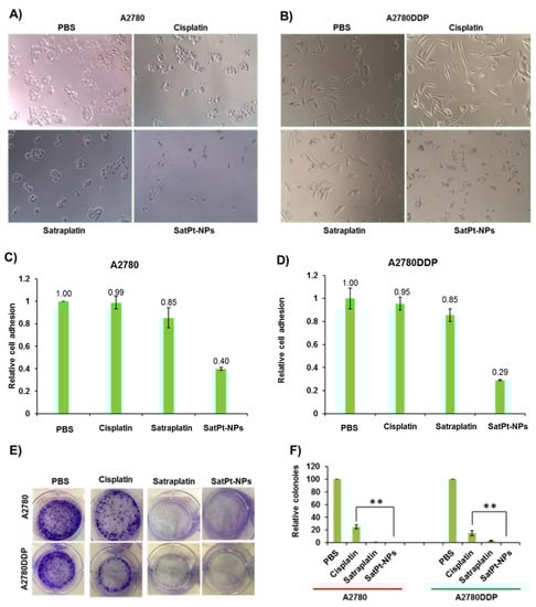 SatPt-NPs induce cell morphology changes and inhibit cell adhesion and colony formation. Cell morphology changes after treatment with cisplatin, satraplatin, and SatPt-NPs at an equivalent drug concentration of 2.5 µM based on Pt for 4 h on A2780 (A) and A2780DDP cells (B). Treatment of the cells with SatPt-NPs can reduce cancer cell adhesion (C,D) and colony formation (E,F) on both A2780 and A2780DDP cells. ** p < 0.01.