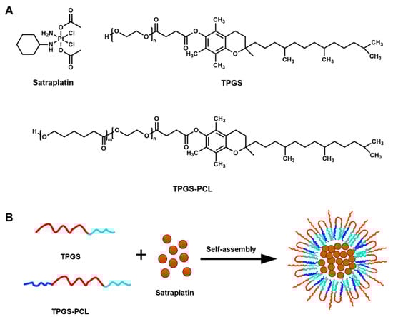 (A) Chemical structures of satraplatin, TPGS, and TPGS–PCL. (B) Schematic diagram to illustrate satraplatin-loaded nanoparticles.