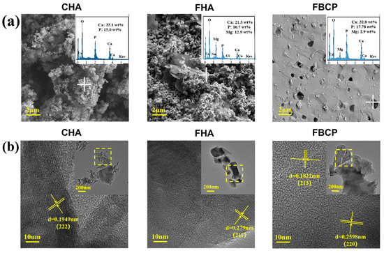 The morphologies of tilapia bone-derived bioceramics and CHA were observed using a scanning electron microscope (SEM). As shown in Figure 2a, the SEM images of the CHA and FHA exhibit similar small granules. On the other hand, the FBCP grains are well joined together and exhibit a porous surface structure, indicating that during the second calcination process, small granules agglomerated and developed into larger ones with larger particle sizes. The corresponding EDS analysis revealed that both the FHA and FBCP contained Mg; however, the magnesium content of the FBCP (2.9 wt%) is lower than that of the FHA (12.9 wt%) because the second gradient of high-temperature calcination of the FBCP promoted the volatilisation of magnesium [39,40], thereby reducing the magnesium content of the FBCP.