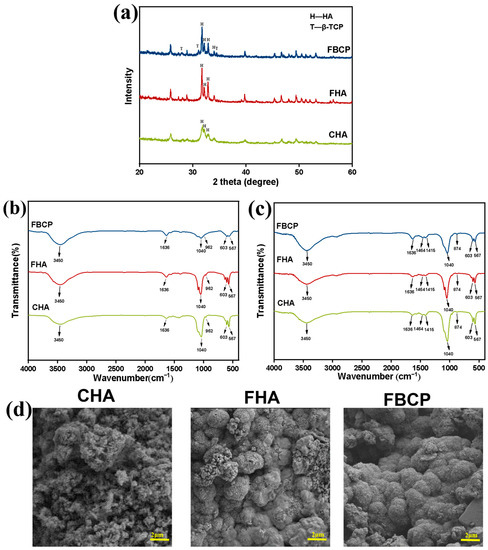 The bioactivity of FHA and FBCP was evaluated by investigating their phase compositions and surface morphologies after immersion in simulated body fluid (SBF) for 14 days (Figure 4a–d). The characteristic peaks of β-TCP in the FBCP were remarkably reduced when compared with the FBCP without SBF immersion (Figure 4a). On the other hand, the relative intensities of the characteristic peaks at 2θ = 31.76°, 32.18°, and 32.92° in the FHA and FBCP increased, which can be attributed to the HA diffracting planes (211), (112), and (300). FTIR was also employed to identify the functional groups present in the various samples. As shown in Figure 4b,c, compared with Fourier transform infrared spectroscopy (FTIR) results before and after SBF immersion, new absorption peaks at 874 cm−1, 1464 cm−1, and 1465 cm−1 emerged which corresponded to a typical CO32− vibration, suggesting that carbonate hydroxyapatite had precipitated on the samples [9,53,54]. The corresponding SEM images show that the surfaces of the FHA and FBCP became coarse and covered with a newly formed dense, plate-like pattern arranged in a regular manner to form the well-known cauliflower-shaped morphology. Therefore, the results confirmed that tilapia bone-derived bioceramics show superior apatite formation capacity.