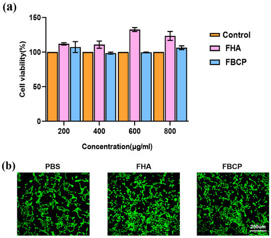 The CCK-8 (Dojindo, Kumamoto, Japan) assay was used to assess the cytotoxicity of the FHA and FBCP using the L929 cells [28]. In short, the cells were seeded into 24-well plates at a density of 1 × 104 per well and incubated overnight at 37 °C in a 5% CO2 incubator. The samples with different concentrations (200 μg/mL, 400 μg/mL, 600 μg/mL, and 800 μg/mL) were added to the 24-well plate and incubated at 37 °C for another 24 h. After that, the culture medium was removed and washed 2–3 times with PBS. CCK-8 was added and cultured in the incubator at 37 °C for additional 2 h. Subsequently, the CCK-8 working solution was aspirated, and 400 μL of DMSO was added to each well in a 24-well plate and incubated on a shaker for 10 min. The absorbance value at 450 nm was detected using a microplate reader (Singapore, model number: Mutiskan Sky), and the cell viability was expressed as a percentage of the control group without treatment. Meanwhile, cell proliferation was further evaluated via live/dead staining. After being incubated with different samples at a concentration of 800 μg/mL for 24 h, the L929 cells were washed three times with PBS and stained for 10 min with acridine orange (AO; Sigma Aldrich, Louis Missouri, DE, USA) and propidium iodide (PI; Sigma Aldrich) solutions. Finally, the stained samples were observed under a fluorescence microscope (Leica DM50000B).