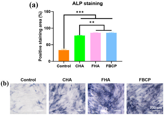 The osteogenic ability of the different samples (CHA, FHA, and FBCP) was measured using alkaline phosphate staining [9]. Before extraction, the samples were sterilized in 70% ethanol and placed under ultraviolet (UV) light for 30 min. The sterilized samples were immersed for 24 h in Dulbecco’s modified Eagle’s medium (DMEM, Thermo Fisher Scientific, Waltham, MA, USA) in order to obtain the leaching liquid, called the conditioned medium. BMSCs cells were seeded in a 6-well plate and cultured with a regular culture medium. After 12 h, the medium was replaced with extracts containing 10% FBS. The BMSCs cultured in the conventional medium were regarded as the control. The ALP produced from the cells in the presence of extracts of the CHA, FHA and FBCP was evaluated after 7 days of culture. The staining was measured with an ALP staining kit in accordance with the manufacturer’s instructions, and the stained cells were photographed under a microscope. The positive staining area was calculated using image J (V1.8.0.112) software.