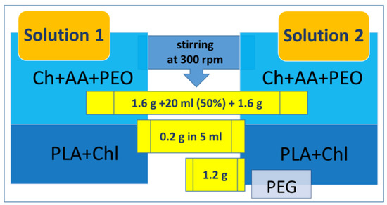 10 mL of 99.9% acetic acid (previously dissolved in distilled water to a final concentration of 50% and up to volume 20 mL) and 1.6 g of chitosan powder were mixed, followed by adding 1.6 g of polyethylene oxide (PEO) and stirring [33]. We dissolved 0.2 g of polylactic acid (PLA) in 5 mL of chloroform (after dissolving, the excess chloroform was removed). Afterward, we mix the Ch solution with the dissolved PLA to obtain Solution 1 [34]. The second sample (Solution 2) was received by adding 1.2 g of PEG to the solution prepared identically to Solution 1. Polymer solutions elaboration is represented in Figure 1.