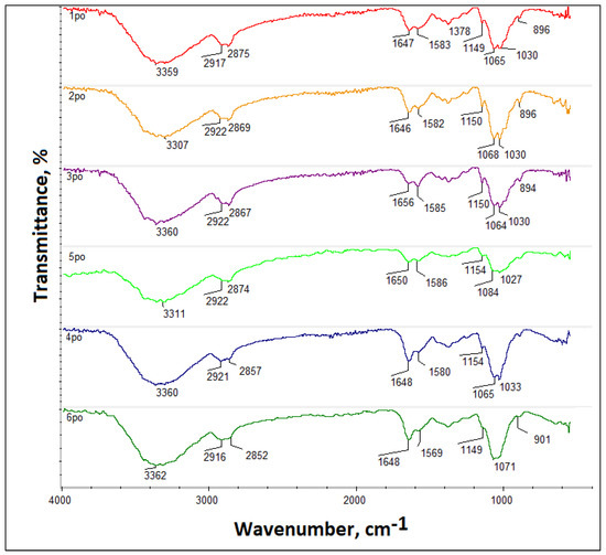 Figure 3 presents the results of the FT-IR analysis. All spectra (1–6) exhibit typical chitosan bands. Electrospun membrane prepared from Ch/PLA composite (sample 1; 1) spectrum shows the band coming from hydroxyl groups of chitosan and PEG at 3380 cm−1. Two bands are typical for aliphatic moieties typical for all three polymers (-CH3 and -CH2-) are present at 2882 cm−1 and 2866 cm−1, respectively. Also, a band of low intensity at 1655 cm−1 coming from N-Acetylglucosamine is present. Furthermore, bands characteristic for free amino groups are visible in the region around 1600 cm−1 and 1147 cm−1. Also, bands that can be assigned to glycosidic bonds and glucopyranose rings at 1099 cm−1 and 842 cm−1 are visible. No band coming from ester bonds is visible due to the low content of PLA in the membrane. Spectrum 2 shows a membrane prepared from chitosan/PEO and PLA/PEO. Again, bands coming from OH groups are present at 3371 cm−1 as well as bands typical for aliphates at 2949 cm−1 and 2882 cm−1. Moreover, band characteristics for amide bonds around 1650 cm−1 as well as for NH2 moieties (1597 cm−1; 1147 cm−1) are visible together with glycosidic bonds between chitosan mers and glucopyranose rings (1061 cm−1 and 842 cm−1, respectively). Spectra 3 and 4 show membranes treated with an aqueous solution of NaOH. In both cases, it can be noticed that the intensity of bands coming from aliphatic groups (membrane 1 and 2: 2949 cm−1; 2879 cm−1) has decreased compared to hydroxyl/carboxyl moieties (3319 cm−1; 3358 cm−1) which suggests degradation of the bonds between polymeric mers, with no visible changes in chitosan structure. Similarly to samples 3 and 4, samples’ 5 and 6 treated with an ethanol solution of sodium hydroxide spectra exhibit increased intensity of the bands coming from -COOH and -OH without a decrease of glycosidic bonds and glucopyranose rings, suggesting that post-processing performed with basic solutions leads to almost negligible changes in the chemical composition of the sample. FT-IR spectra show that it was possible to obtain composite material composed of three different polymers, which combined may be superior to pure chitosan.