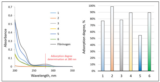 Figure 4 reveals the results of the adhesive properties study. Biomaterials dedicated to tissue engineering should exhibit bioactive properties and promote cell proliferation. During the regeneration process, a crucial role plays in various proteins that enable new tissue formation and neovascularization. Therefore, the ability of biomaterials to enhance biomolecule adherence constitutes a very promising feature. As shown in the FT-IR spectrum, all of the newly developed samples exhibit adhesive properties, which confirm the intensity increase of the band’s characteristic for peptide bonds in the region around 1600 cm−1, thus proving fibrinogen presence at the membranes’ surface. Adhesive properties can be assigned to the chemical composition of the membranes, especially the presence of amino groups in the chitosan structure, which undergo protonation resulting in the attraction of negatively charged proteins. Moreover, highly developed specific surfaces due to the porosity of the nanofibrous biomaterials additionally positively affect proteins adhesion. Noteworthy, the highest amount of adsorbed fibrinogen can be spotted for samples 5 and 6 (treated with ethanol NaOH solution), which confirms the high intensity of the bands at 1648 cm−1 and can be assigned to the high number of hydrophilic moieties. To further investigate adhesive properties, UV-Vis analysis has been carried out. As shown in Figure 5, all samples exhibited the ability to interact with fibrinogen which confirms a decrease in the intensity of the UV-Vis spectra compared to the initial protein aqueous solution. It can be noticed that the highest ability to adsorb fibrinogen exhibits sample 2. Similarly, samples 4 and 6. The worst results were collected in the case of sample 5; however, the adsorption degree exceeds 50%. Obtained results correspond to the data given in Figure 5.