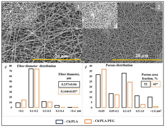 SEM: electrospun membranes (1—Ch/PLA and 2—Ch/PLA-PEG), frequency of “fiber diameter distribution” and “porous area fraction” value of electrospun membranes. The magnification of the main images is ×5.0 K (scale bar = 20 µm). *—denote significant differences between groups at * p ≤ 0.05.