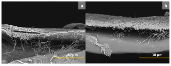 Cross-sectional view of membranes (a—Ch/PLA and b—Ch/PLA-PEG).