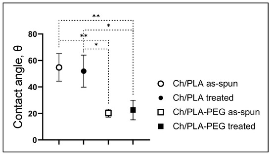 The fibers electrospun from the Ch/PLA solution exhibited a wettability value of 54.77 ± 10.38° and from Ch/PLA-PEG solution 51.97 ± 12.11°, as shown in Figure 8. However, it is known that increasing surface hydrophilicity can significantly improve the biocompatibility and functionality of materials [44]. Given the increased surface area of nanoscale fibers, maximizing their surface hydrophilicity becomes particularly important. Therefore, in order to enhance the wettability of the Ch/PLA membrane, it is necessary to adjust the composition and proportion of the blend components. Our test results demonstrate that the presence of PEG improves the hydrophilicity of the membrane, reducing the contact angle to 20.28 ± 3.06° and 22.65 ± 7.40° for as-spun and treated samples, respectively. This improvement can be attributed to the higher hydrophilicity of the PEG block compared to PLA, leading to enhanced overall hydrophilicity [45].