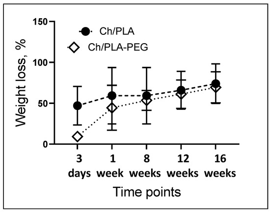 When the copolymer comes into contact with water, the molecular chain of PEG breaks down faster than that of PLA. Therefore, the copolymer containing PEG exhibits a better degradation rate [46]. The addition of PEG to the spinning solution did not increase the weight loss of the electrospun membranes during the degradation experiment. Hybrid fibrous materials made from Ch/PLA-PEG co-solvent system demonstrate a slightly lower degradation rate (during the first week of the test) (Figure 9). The process seems to be slightly accelerated in the Ch/PLA samples. However, statistical analysis indicates the degradation profile of PEG-free and PEG-containing fibers are not significantly different. The observed outcome is a result of the secondary interactions that take place between the PLA and the Ch during the dissolution of polymers that can undergo hydrolysis. These interactions produce shorter chains in the acid medium [47].