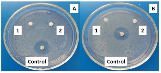 Disk diffusion assay: MH-agar plates after E. coli (A) and S. aureus (B) incubation with the electrospun membranes (1—Ch/PLA and 2—Ch/PLA-PEG).
