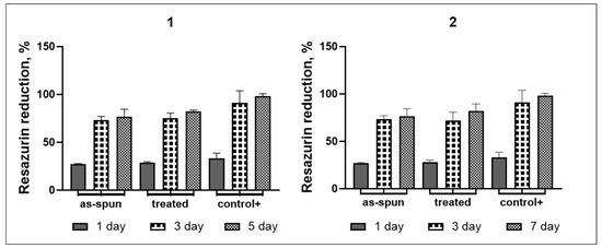 Alamar blue reduction assay data on the proliferation of B16 F10 mice melanoma cells on electrospun membranes (1—Ch/PLA and 2—Ch/PLA-PEG) during the 5-day experiment.