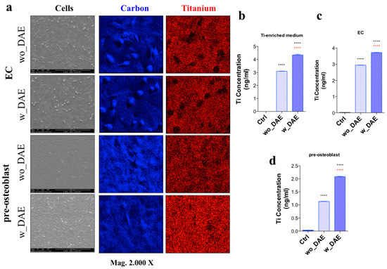 - Fernandes, C.J.D.C.; Bezerra, F.J.; Souza, B.D.C.; Campos, M.A.; Zambuzzi, W.F. Titanium-enriched medium drives low profile of ECM remodeling as a pre-requisite to pre-osteoblast viability and proliferative phenotype. J. Trace Elements Med. Biol. 2018, 50, 339–346. [Google Scholar] [CrossRef]