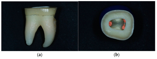 For the purposes of the present study, 48 extracted, caries-free mandibular human molars with complete root formation were selected. All subjects gave their informed consent for use of their extracted teeth for the purposes the study. The study was conducted in accordance with the Declaration of Helsinki, and the protocol was approved by the Research Ethics Committee of the Dental School (393A/29.11.2018). The teeth had similar mesiodistal and buccolingual dimensions and were stored in 0.1% thymol solution at room temperature. All teeth were prepared for endodontic treatment, with diamond burs in high-speed handpiece and tungsten carbide burs in low-speed handpiece. Root canals were mechanically shaped with NiTi instruments (Protaper Universal Rotary; Dentsply, Johnson City, TN, USA) and a low-speed handpiece (Endomate, NSK, Eschborne, Germany) with continuous 5% sodium hypochlorite irrigation. Root canal obturation was performed with warm gutta-percha points (Gutta-percha Points, Dentsply, USA) and epoxy resin filling (AH Plus, Dentsply, USA) combined with a vertical compaction technique (System B, Sybron Dental, Orange, CA, USA). The gutta-percha was cut 1 mm below the orifices of the root canals. Cusps were cut parallel to the occlusal surface 2 mm above the cementoenamel junction (Figure 1a). Margin preparation was performed horizontally with a width of about 3 mm (Figure 1b). The morphology of the pulp chamber was preserved, internal angles were rounded, and recesses were eliminated. The walls of the pulp cavity were divergent 8–10° (Figure 1b).