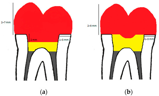 Tooth preparation design of endocrown (a) and overlay (b) with dimensions. Red color: restoration (endocrown/overlay), yellow color: resin composite, grey color: guttapercha.