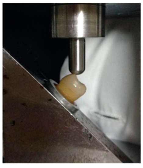 Specimen mounted on the universal testing machine. A 6 mm diameter stainless-steel round ball applies a compressive force at an angle of 45° to the long axis of the tooth on the buccal cusps.