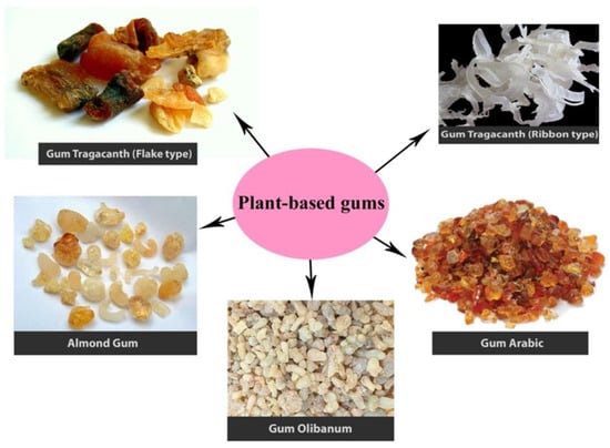 Figure 6 illustrates the various MGs derived from plant sources. Mucilage and gums (MGs) have been derived from animals, plants, microorganisms, and seaweed. MGs are more abundant in plants than in animals. The gums derived from herbal plants were applied as emulsifying, binding, thickening, suspending, stabilizing, and binding agents and sustained the drug release. Non-ionic (amylose, arabinans, and cellulose) and anionic (arabic, agar, algin, and pectic acid) MGs are available. MGs were extracted via heating and solvent extraction methods. Due to its sticky and mucoadhesive nature, MGs found an application in DDS. Additionally, the compounds present in the gums, named resins and tannins, provide a controlled drug release and inhibitory properties. The highly viscous and gradual swelling-induced slow aqueous solubility behavior of MGS increases the residence time of drug loading on the biological surface, such as ocular and gastrointestinal tracts; thereby, MGs are considered as the suitable carrier matrix for prolonged or sustained drug release. The constant contact established between the biological surface and DDS minimizes the drug resistance. Some of the important DDS-based MGs are discussed in this section [