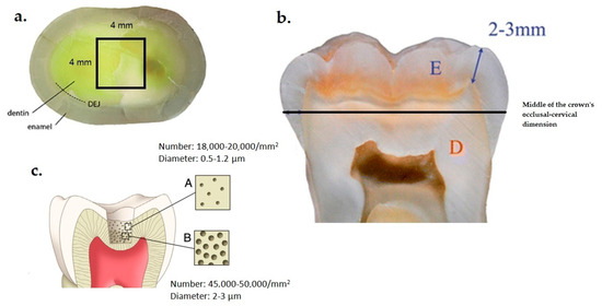 Figure 1b) using a low-speed precision sectioning machine (Isomet 11-1180 Buehler, Lake Bluff, IL, USA) with water cooling. At this depth of dentin, the number of the exposed tubules varies from 18,000–20,000/mm