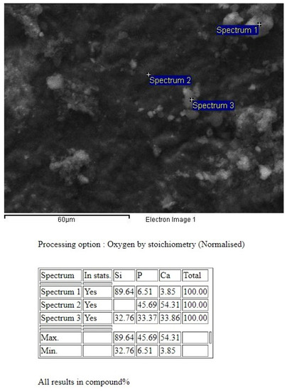 26]. In the context of the current study, the utilization of ProSylc air-abrasion unveiled the presence of a safeguarding layer of hydroxyapatite, as evidenced by SEM-EDS analysis. This hydroxyapatite layer, enriched with calcium and phosphorus, encompassed nearly the entirety of the dentin surface. Furthermore, an additional peak corresponding to silicon (Si) was detected, signifying the inclusion of bioactive glass. These outcomes signify the successful integration of bioactive glass particles into the treated dentin, facilitating remineralization stimulation and closure of the dentinal tubules.