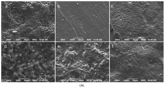 The statistical analysis of the data was implemented using IBM Corp’s SPSS Statistics 25.0 software (Chicago, IL, USA). The data’s normality and homogeneity were assessed through the Shapiro–Wilk and Levene tests, respectively. The diameter of open tubules (μm) and the number of open tubules per 0.01 μm2 were subjected to a one-way ANOVA, and significant differences between the experimental groups were revealed using Tukey’s test at a significance level of 0.05. As the evaluators provided tubule occlusion levels as scores, a nonparametric test was used for the evaluation procedure. The Kruskal–Wallis test was employed to compare these values among the different groups. Additionally, the Mann–Whitney test was used to make separate comparisons between the groups. Furthermore, a p-value of less than 0.05 indicated the presence of a significant difference between the tested groups.