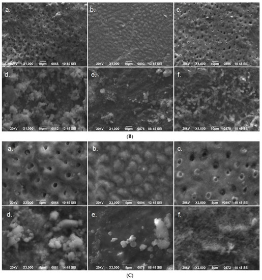 Figure 3A–C illustrates representative SEM images of the treated dentin surfaces of each experimental group at ×500, ×1000, and ×3000 magnification.