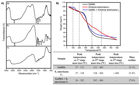 (A) FTIR spectra in vibrational regions from 4000 to 500 cm−1 for Ximenia americana L. (a), GelMA, and (b) GelMA + Ximenia americana L. (c). (B) Thermal analysis results.