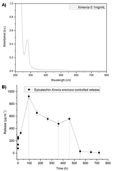 (A) UV-Vis spectrum of the Ximenia americana L. extract. (B) Controlled release of epicatechin as a function of time from the GelMA + Ximenia americana L. hydrogel.