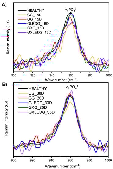 Figure 4 C,D presents the spectra for the crystallinity given for the inverse of the width at half height of the peak after 15 and 30 days, respectively. Such data evaluate bone composition by the deposition of new hydroxyapatite crystals in newly formed bone. The crystallinity found in the treated groups (p < 0.0001), and of the healthy bone (p < 0.001), was significantly higher than that of the control group after 30 days of treatment, with no statistical difference being observed comparing the treated groups. At 15 days of treatment, a statistical difference was observed comparing the healthy group and CG (p < 0.05), where the CG had lower crystallinity. The mineral crystallinity results obtained from techniques such as Raman spectroscopy provide valuable information about the size and maturation of mineral crystals in bone tissue, as mentioned in refs. [,]. Reduced crystallinity indicates the presence of younger and smaller mineral crystals at the injury site. During the early stages of bone healing, the rapid mineralization process leads to the formation of smaller crystals with lower levels of organization. These crystals may have a higher proportion of non-stoichiometric substitutions and a less defined crystal lattice structure, resulting in reduced crystallinity values. As the bone healing progresses and the tissue matures, the mineral crystals undergo a process of growth and maturation. This is characterized by the replacement of carbonate ions and the incorporation of additional mineral components, leading to larger and more ordered crystals. The increased crystallinity reflects the improved organization and structure of the mineral crystals, indicating a higher degree of maturation [].