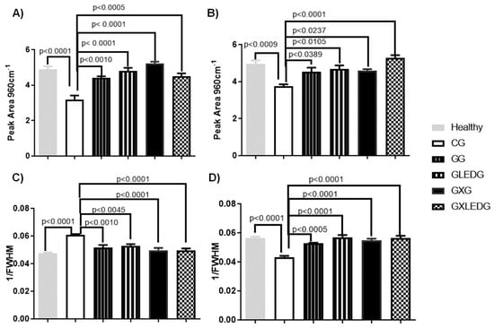 Figure 4 A,B presents the spectra of the integrated areas of the band centered at 960 cm−1 (related to υ1 PO43−) after 15 and 30 days, respectively, which is related to the carbonated apatite data. On the 15th day of the experiment, a statistical difference was observed when comparing all treated and control groups, suggesting an increase in PO43− deposition that is statistically significant (p < 0.0001) between the GLEDG (GelMA + LED) and GXG (GelMA + Ximenia americana L.) groups, with p < 0.001 for the GXLEDG (GelMA + Ximenia americana L. + LED) and GG (GelMA), confirming the findings in Figure 3. A difference (p < 0.05) was also found between the GG (GelMA) and GXG (GelMA + Ximenia americana L.) groups, also noting that the control group had a significantly lower PO43− deposition than healthy bone (p < 0.0001). After a period of 30 days, a statistical difference comparing all treated and control groups was observed, identifying an increase in PO43− deposition, being statistically significant (p < 0.0001) between the GXLEDG (GelMA + Ximenia americana L. + LED) and control groups, and p < 0.05 between the GLEDG (GelMA + LED), GXG (GelMA + Ximenia americana L.) and GG (GelMA) groups. A difference (p < 0.05), was also found between the GG (GelMA) and GXLEDG (GelMA + Ximenia americana L. + LED) groups, also noting that the control group had a lower PO43− deposition than healthy bone (p < 0.001).