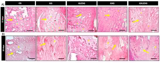 Figure 5 provides a representative histological overview of all the experimental groups at two different time points, specifically 15 days (A) and 30 days (B) after the bone defect was created. After 15 days, for the CG, GG, GLEDG and GXLEDG groups, the presence of granulation tissue and a slight new bone formation can be observed in the entire defect. However, the GXG group presented a greater presence of new bone tissue sites when compared to the other experimental groups.