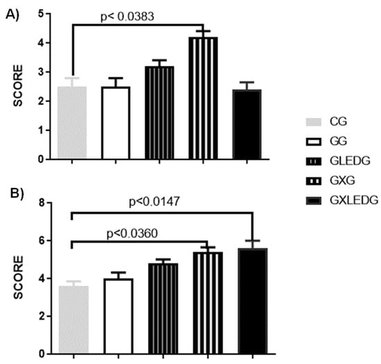 Figure 6 A,B demonstrates the semi-quantitative results of bone repair. In the analysis of the samples at 15 days after surgery, the bone repair score of the GXG group was significantly higher compared to the CG. However, no significant difference comparing the score results for the GG, GLEDG, and GXLEDG groups was observed 15 days after surgery.