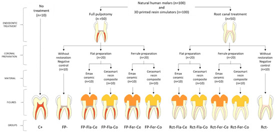 Study design. C+: sound teeth (positive control); FP−: teeth with FP and no restoration (negative control for FP-treated teeth); FP-Fla-Ce: FP-treated teeth restored with a flat margin ceramic endocrown; FP-Fla-Co: FP-treated teeth restored with a flat margin composite endocrown; FP-Fer-Ce: FP-treated teeth restored with a ceramic endocrown with 2 mm circumferential ferrule; FP-Fer-Co: FP-treated teeth restored with a resin composite endocrown with a 2 mm circumferential ferrule; Rct-Fla-Ce: root-canal-treated teeth restored with a ceramic endocrown with a flat margin; Rct-Fla-Co: root-canal-treated teeth restored with a resin composite endocrown with flat margin; Rct-Fer-Ce: root-canal-treated teeth restored with a ceramic endocrown with a 2 mm circumferential ferrule; Rct-Fer-Co: root-canal-treated teeth restored with a composite endocrown with a 2 mm circumferential ferrule; Rct−: teeth with RCT without restoration (negative control for root-canal-treated teeth). This study design was duplicated with 3D-printed resin simulators.