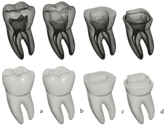 - Meng, Q.; Zhang, Y.; Chi, D.; Gong, Q.; Tong, Z. Resistance Fracture of Minimally Prepared Endocrowns Made by Three Types of Restorative Materials: A 3D Finite Element Analysis. J. Mater. Sci. Mater. Med. 2021, 32, 137. [Google Scholar] [CrossRef]