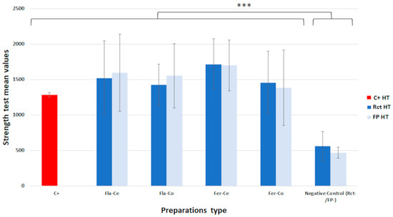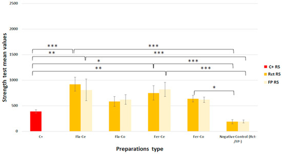 For the human teeth groups, the ANOVA test separated two homogeneous groups, the negative controls grouping the root-canal-treated teeth or full-pulpotomy-treated teeth without coronal restoration (Rct− and FP−) and all the other samples, i.e., the untreated sound teeth (positive control, C+) and the treated and restored teeth. The negative control groups showed significantly lower resistance than the untreated sound teeth or the teeth treated with coronal restoration.