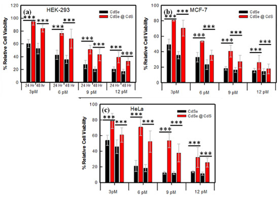Comparative cell viability of CdSe and CdSe@CdS nanocrystals at 24 and 48 h assessed using the MTT assay. (a) Human kidney embryo (HEK-293), (b) human breast cancer (MCF-7), and (c) human epitheloid cervix carcinoma (HeLa). Statistical analysis of variation in data shown in figures by one-way ANOVA and Tukey’s test. *** p < 0.001 compared to control, or between the indicated groups.