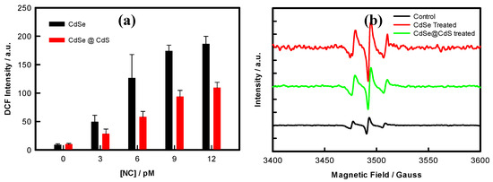 The DCF fluorescence, i.e., an indicator of oxidative stress (OS), was measured in the cells after 24 h treatment with CdSe and CdSe@CdS NCs. The reactive oxygen species level in the CdSe NC-treated cells was higher than in the CdSe@CdS NC-treated cells at the same concentration (Figure 3a). The fluorescence intensity of the DCF-positive cells increased significantly in a dose-dependent manner with CdSe NCs. In contrast, for the cells treated with CdSe@CdS NCs, the DCF intensity did not increase significantly. These results indicate that the surface coating of CdS reduced the release of free radicals, which may be the reason for the lower oxidative stress in the CdSe@CdS NC-treated cells.