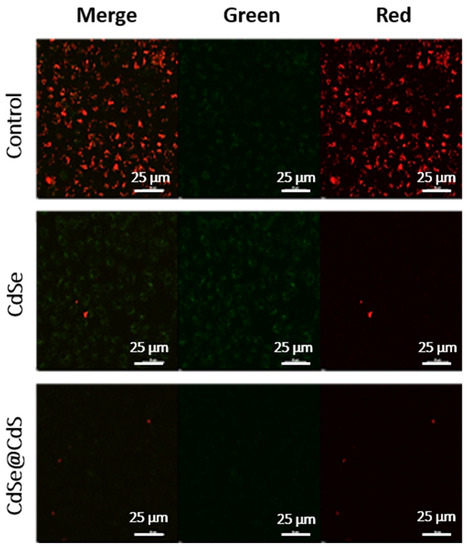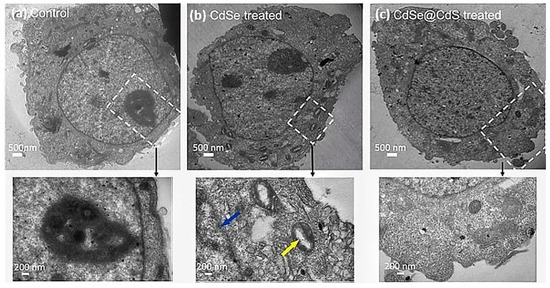 The present study observed significant dose-dependent morphological changes characteristic of apoptosis. Cells were found to show apoptosis features, i.e., cell shrinkage in the CdSe-treated group, whereas CdSe@CdS did not induce any significant change in the cell integrity when applied at lower doses. However, changes were more significant in CdSe NC-treated cells than CdSe@CdS NC-treated cells at similar doses. The ultra-structural results show that the control cells were large and round, with an intact nuclear membrane and low density of nuclear chromatin. However, the cells treated with CdSe nanocrystals exhibited characteristics of apoptosis, including vacuolization in mitochondria, condensation, and fragmentation of nuclear chromatin adjacent to the nuclear membrane. In contrast, the cells treated with CdSe@CdS showed no significant alteration. These results show that CdSe@CdS caused no significant morphological damage, whereas CdSe nanocrystals induced cell apoptosis. This indicates that coating a CdS shell onto a core of CdSe reduced the release of free radicals, which may have caused cytotoxicity (Figure 6).