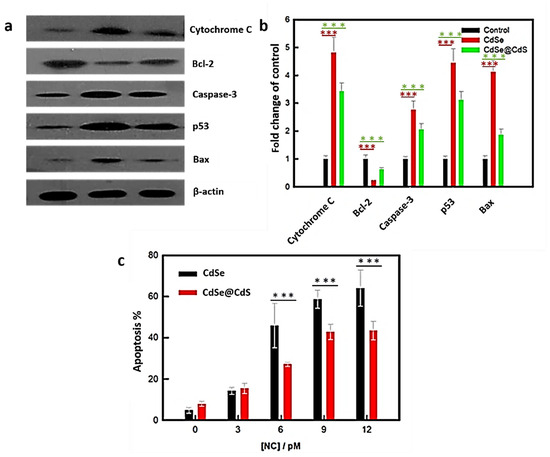 Effects of NCs of the molecular mechanism of apoptosis. (a) Changes in the expression of apoptosis regulatory proteins in response to treatment with 12 pM CdSe CdSe@CdS NCs. (b) Bar diagram represents the mean change in band intensity (protein level/b-actin value normalized with untreated control). (c) Apoptosis percentage of HeLa cells after 12 h exposure to different NCs (with and without CdS coating) at different concentrations. Statistical analysis of variation in data shown in (b,c) using one-way ANOVA and Tukey’s test, *** p < 0.001 compared to control, or between the indicated groups.