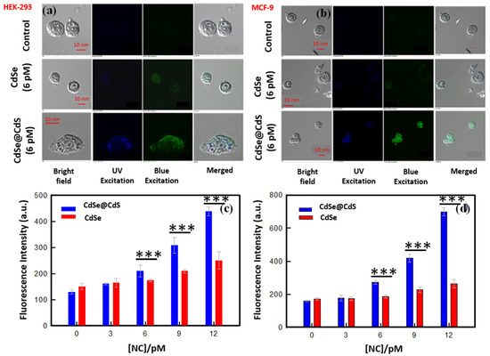 Confocal laser microscopy is a widely used technique for high-resolution imaging of cells. Fluorescent CdSe quantum dots are ideal probes for imaging cells [39]. Remarkably, we noticed that fluorescent CdSe nanocrystals were internalized by HeLa and HEK-293 cells and adsorbed onto the cell membrane. Still, the fluorescence intensity was low, at only two times the control. When these cells were treated with the same concentration (12 pM) of CdSe@CdS nanocrystals, the fluorescence intensity increased by roughly four times (Figure 7). This implies the cellular internalization of these nanocrystals. At higher dosages of CdSe nanocrystals, cell membranes were found to be ruptured due to the generation of reactive oxygen species. The comparative imaging revealed distinctive features of normal cell lines (HEK-293) and cancerous cell lines (HeLa). It was clearly observed that CdSe@CdS (and CdSe) adsorption was higher in HeLa cells compared to HEK-293 cells treated with the exact same dosage of nanocrystals. This difference in internalization between cancerous and normal cell lines could be assigned to different degrees of cell surface charge, the thickness of the membrane, and the higher turnover rate of cancer cells compared to normal cells. This study revealed that the enhanced fluorescence intensity and biocompatibility of the core–shell structures of CdSe@CdS demonstrate the potential to be used in cell imaging applications.